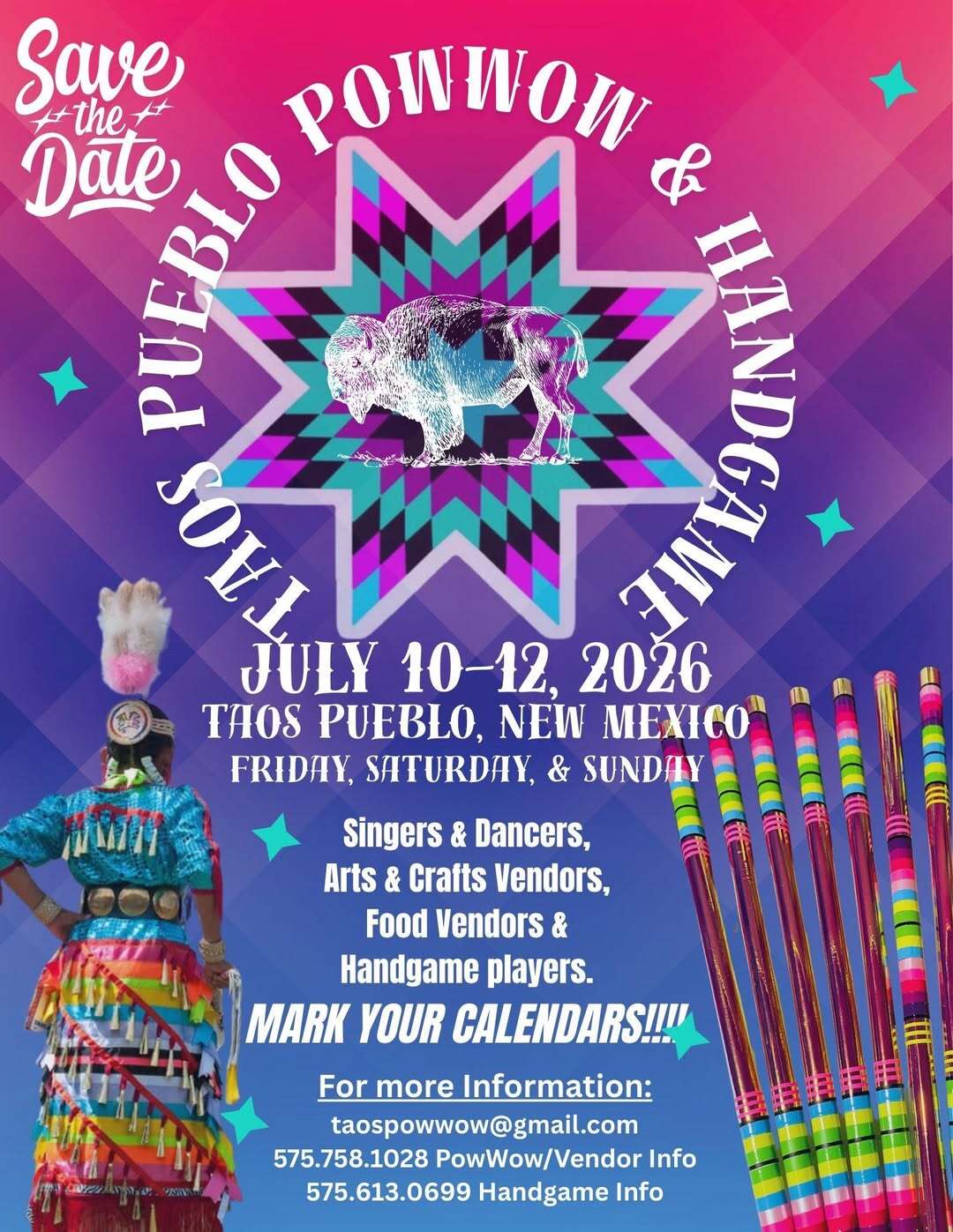 All are welcome to the Taos Pueblo Powwow at the powwow grounds located off of Hwy 64 and Ben Romero Rd. (turn north at Overland Sheepskin Co.) at Buffalo Pasture Road. Introducing Traditional Handgames to our community, friends, and family. A weekend of fun, dances, songs, arts & crafts, and food.